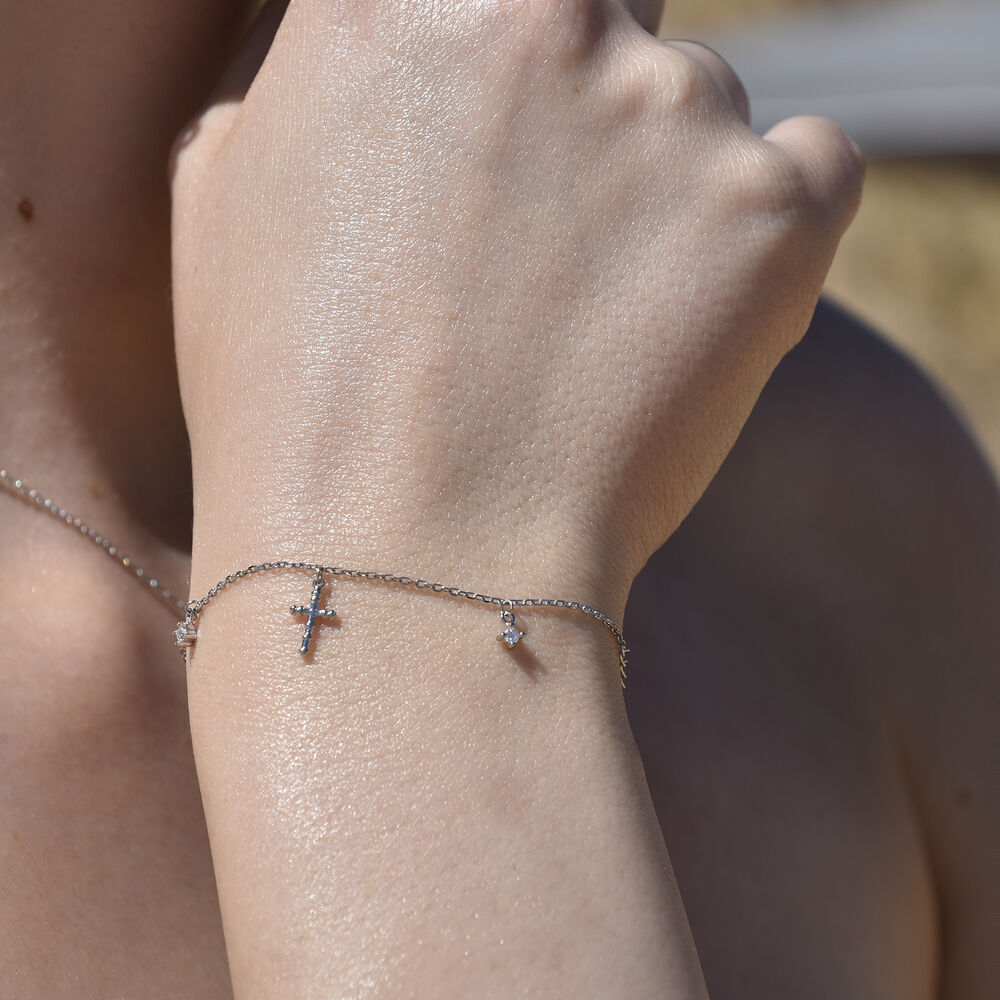 Chic, refined and detail rich. Introducing Adina Fine Diamante Cross Charm Bracelet (Silver) - a delicate wrist love exuding religious virtues. This design features a fine gold chain with 3 Austrian zircons and 2 cross charms evenly attached apart. This bracelet and the charms are made in solid sterling silver with rhodium plating to ensure hypoallergenic wear, durability, and an extra anti-tarnish protection. This bracelet is 19cm long including a 3.5cm adjustable link to suit your ideal fit. Perfect for modern, retro, delicate, fine, girly, religious, smart casual, casual, everyday styles and more. Perfect for wearing on its own or layering with other bracelets. Hypoallergenic, nickel, cadmium and lead free.