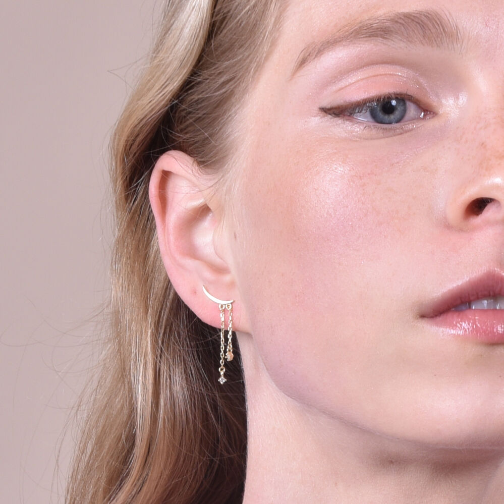 Delicate, romantic and dreamy. Introducing Ariella Dainty Moon String Mismatching Earrings (Gold) - a stylish and sweet mismatched ear love for your unique chic styling. This design features 2 chain-drop pieces both with a highlight of moon - one earring with a smooth polished crescent moon on the top, and the other earring with a zirconia embellished crescent moon on the top. The earrings are made in sterling silver with 18k gold plating to ensure hypoallergenic wear. Perfect for modern, retro, bohemian, chic, girly, earring multi layering, smart casual, casual and everyday styles. Suitable for women and girls of all ages. Also suitable in silver. Hypoallergenic, nickel, cadmium and lead free.