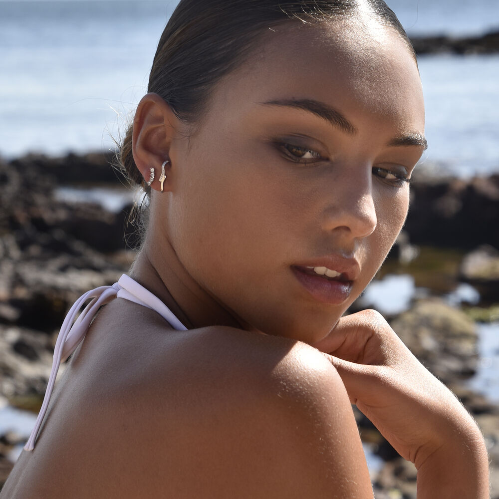 Modern, artsy and unique. Introducing Berte Artsy Ear Hook Stud Earrings (Silver) - a delicate and unique ear stud for a subtle shimmer and curl. This design features two curved lines vertically aligned and connected in the middle, with the top section fully embellished with a row of Austrian zirconia diamantes. The earrings are made in solid sterling silver for hypoallergenic wear. Perfect for modern, artsy, creative, minimalist, earring layering, chic, smart casual, casual styles and more. Hypoallergenic, nickel, lead, and cadmium free.