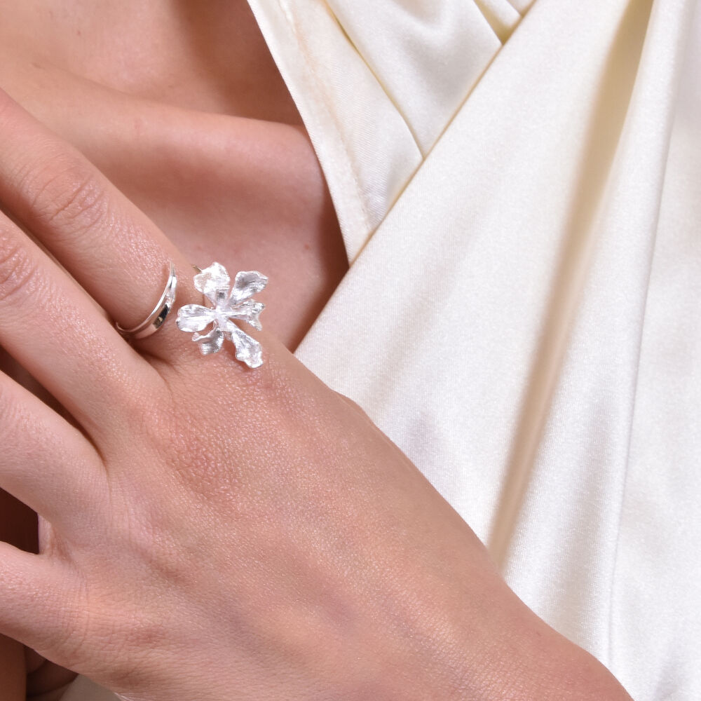 Fineness, rawness and creativity interweave. Introducing Bloom Artisan Silver Open Ring a soul-flying artisan finger art exhibiting fine jewellery craftsmanship. This elegant and unique piece of art is handcrafted in solid sterling silver. The ring band is finely polished with a smooth subtle open curve, while the blooming flower element exudes fine textured details. This ring is fully resizable and adjustable manually so you can adjust for the most perfect fit. Perfect for modern, creative, high fashion, bold, feminine, elegant, smart casual, artsy styles and more. Hypoallergenic, nickel, cadmium and lead free.