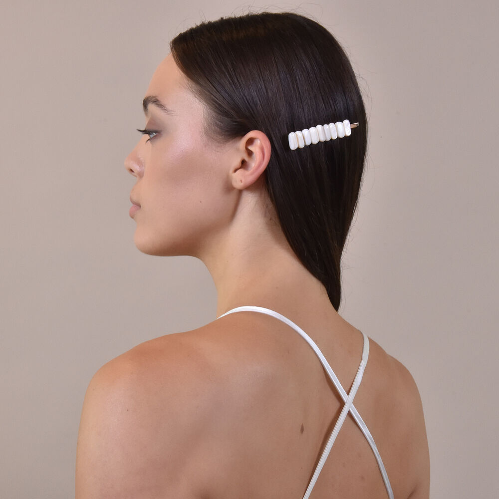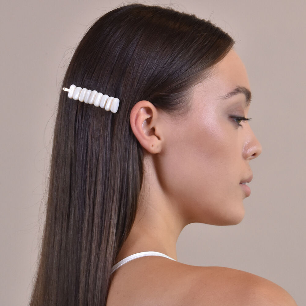 Soothing, calming and earthy. Introducing Calista Beige Muse Hair Clip a modern coastal style barrette for a relaxed and elevated touch. This piece features 9 pieces of beige resin blocks neatly lined up on a gold-coloured hair clip. Perfect for modern, retro, chic, relaxed, coastal, summer, beach, earthy, casual styles and more.
