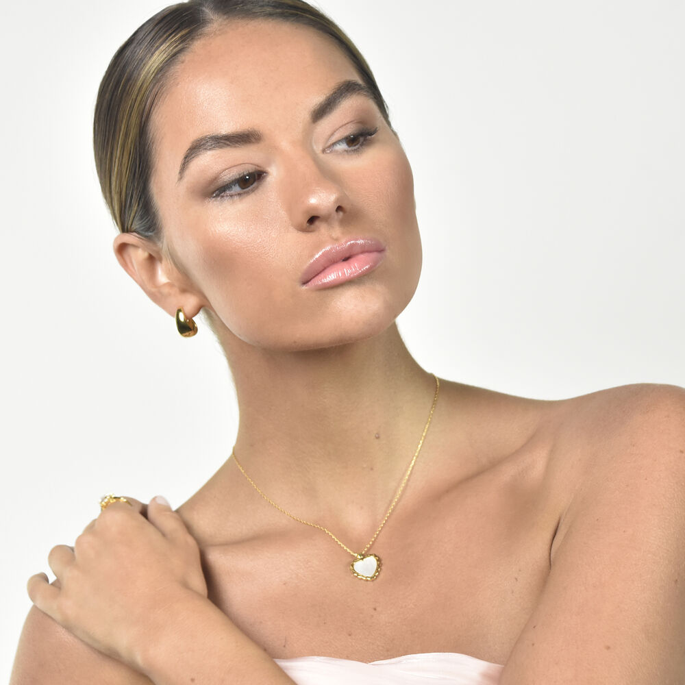 Elegant, romantic, and timeless. Introducing Charme Mother of Pearl Heart Pendant Necklace (Gold Vermeil) - a classic and chic neckpiece with a French romantic charm. This design features custom cut and polished natural mother of pearl in a love heart shape embedded in a love heart shaped solid sterling silver frame. This neckpiece is made in solid sterling silver with 2.5 microns of 18K gold plating for hypoallergenic and enduring wear. A classy piece that is not subject to trends. Perfect for modern, retro, feminine, chic, girly, coastal, necklace layering, minimalist, smart casual, casual and everyday style. Hypoallergenic, nickel, lead, and cadmium free.