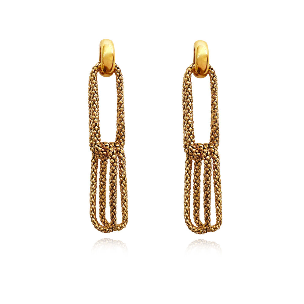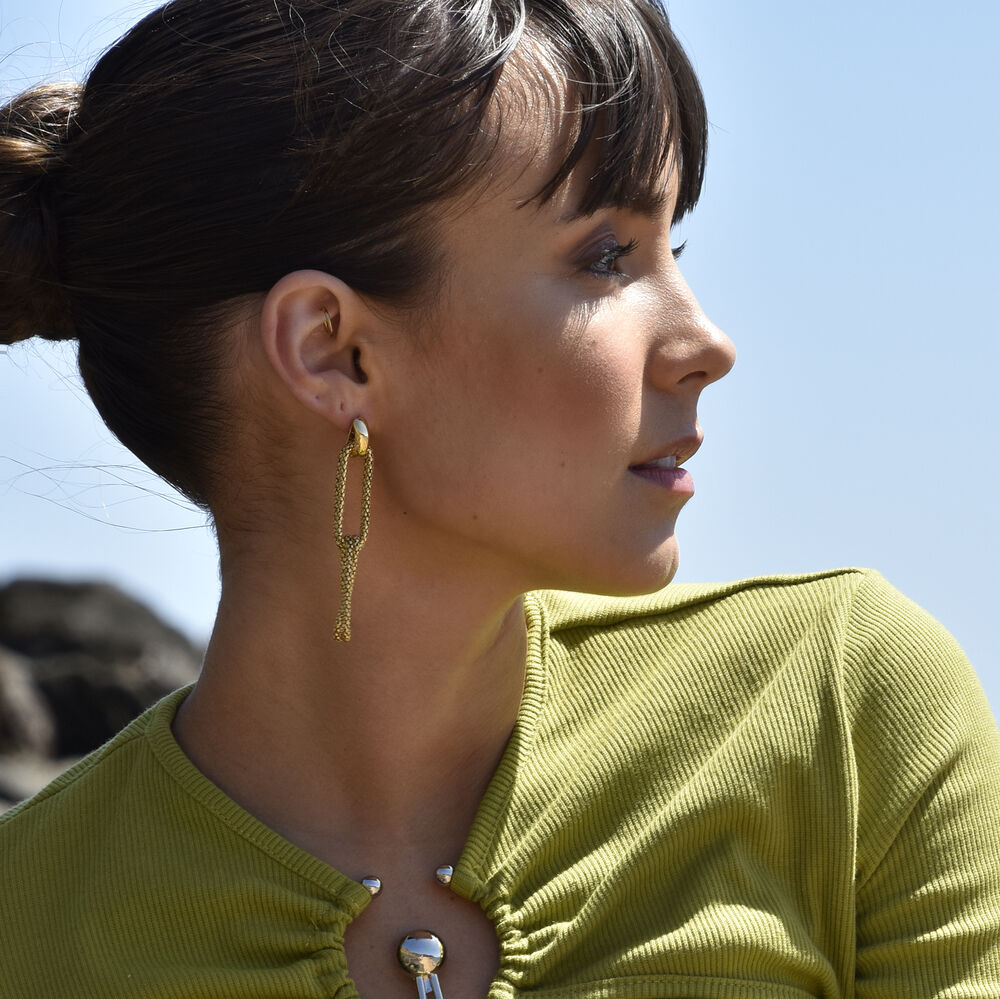 A stylish combo of a unique snake link and a D-shaped top. Introducing Daniella Twin Loop Chain Drop Earrings - a contemporary style chain drop statement for lovers of style and uniqueness. This design features a snake scale patterned chain in twin double loops tied in a knot. The earrings are made in environmentally friendly brass (nickel free) with 2 microns of 18K gold plating (4 times thicker than average fashion jewellery) for hypoallergenic and enduring wear. Perfect for modern, artsy, chic, punk, creative styling, fashion events, smart casual, casual styles and more. Hypoallergenic, nickel, cadmium and lead free.