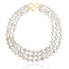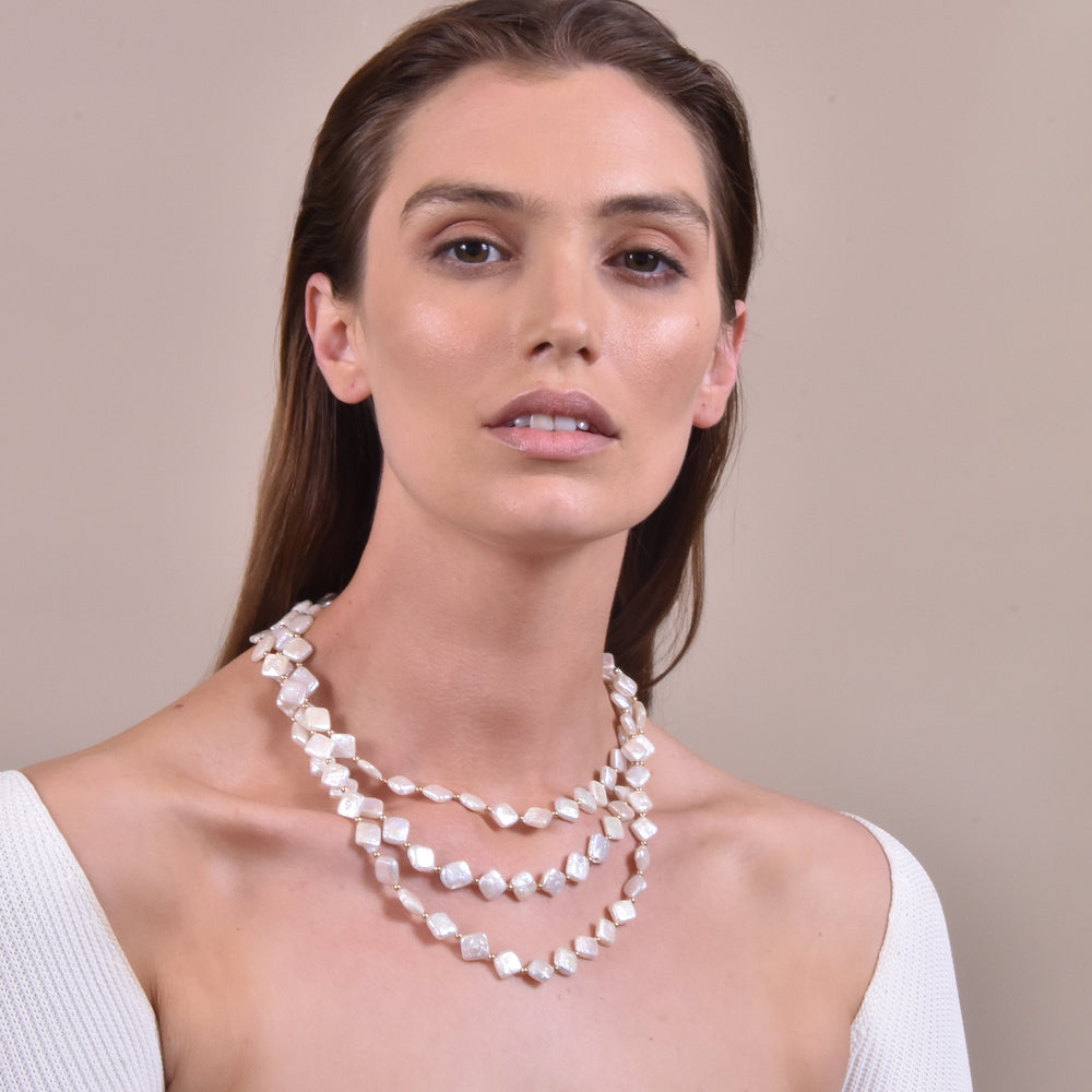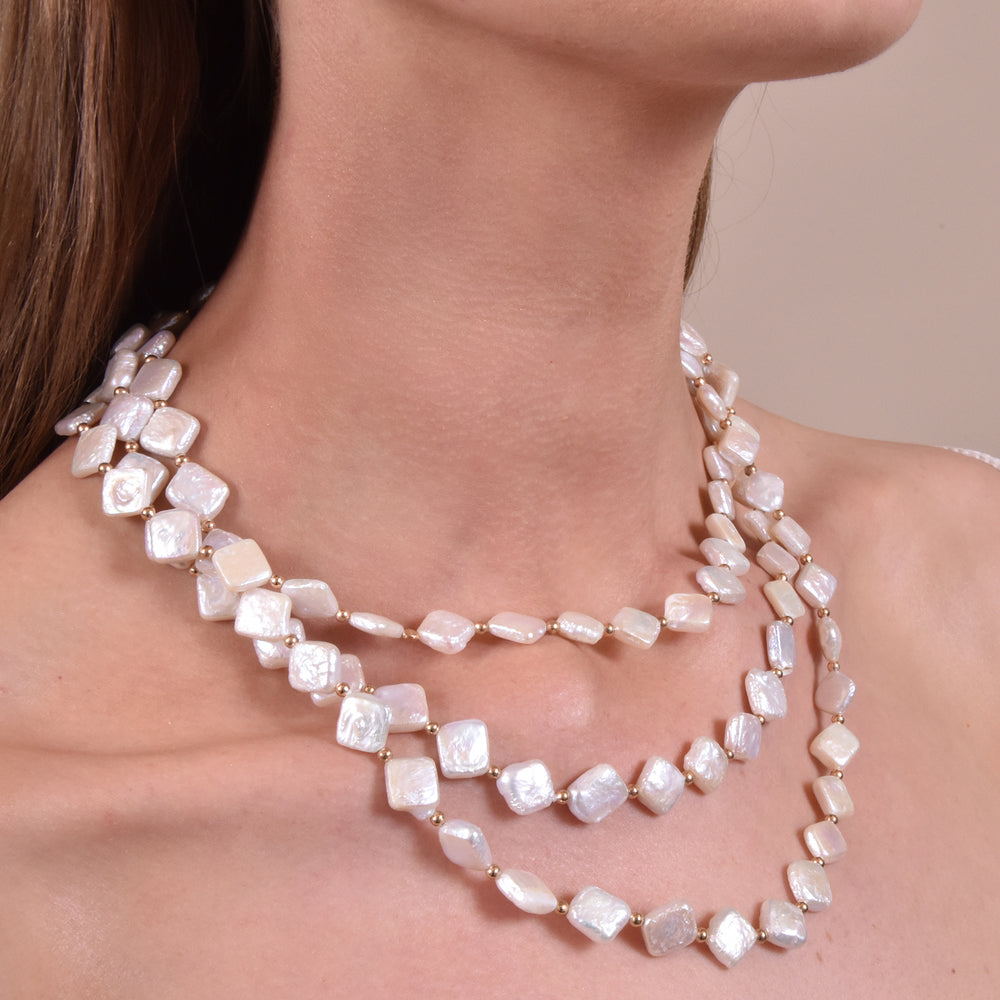 Luxury, sophisticated and one of a kind. Introducing Florence Luxury Diamond Pearl Layering Necklace - a luxurious artisan-crafted pearl art piece for lovers of luxury and uniqueness. This design features natural diamond-shaped freshwater pearls hand-threaded with gold beads separating each pearl. The neckpiece falls in an elegant fashion with 3 strings of pearl drapes, with each string connecting to the circle clasps at 2 ends. The gold beads and clasps are made in environmentally friendly brass with 18k gold plating, adding a subtle gold sparkle to the piece, and complementing the pearl lustre and shimmer. A timeless pearl statement for luxury, vintage, evening, high-end styling, modern, coastal, formal, semi-formal, dressy, smart casual, and more. Hypoallergenic, nickel, cadmium and lead free.