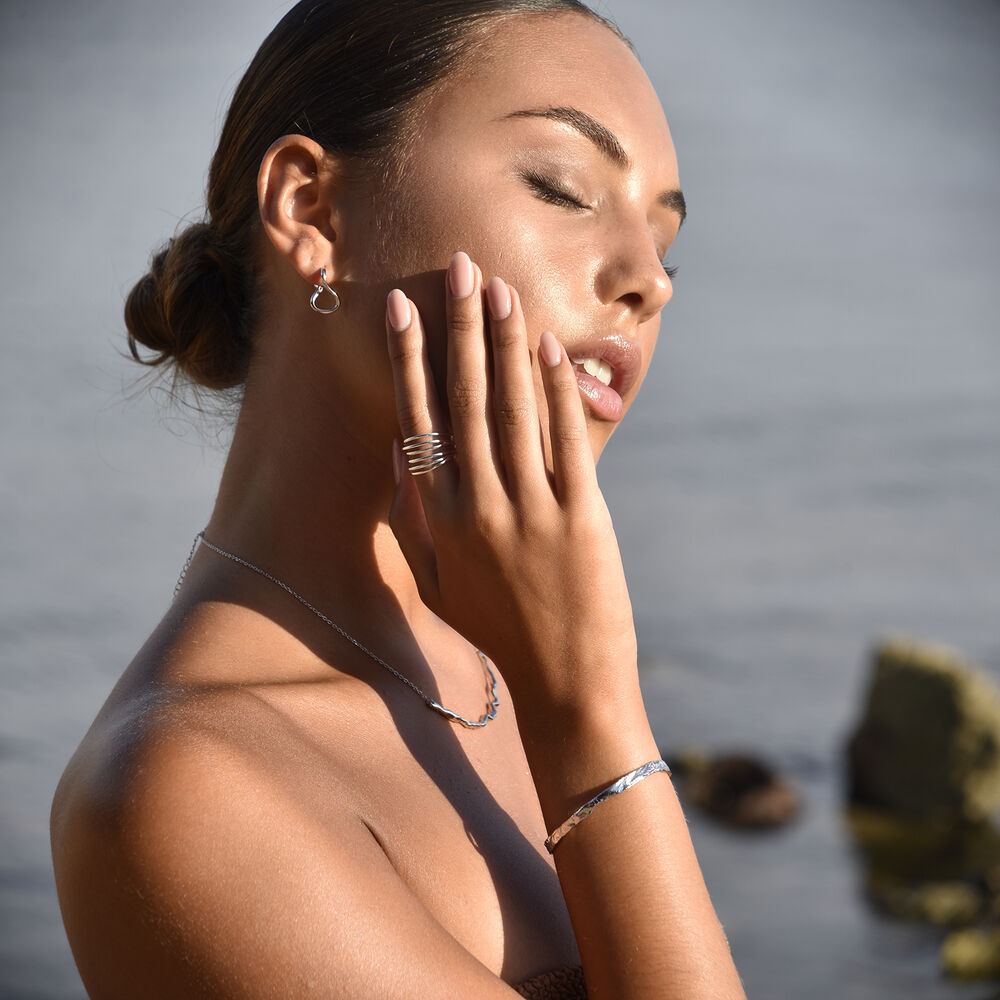 Introducing Fossette Artisan Textured Bangle (Silver) - an artisan crafted art deco style wrist love with a highlight of textures and rawness. This design is inspired by coastal textures embodied in nature. This bangle is crafted in solid sterling silver for hypoallergenic and enduring wear. This bangle can be easily adjusted manually for your personal fit. Perfect for modern, artsy, creative, chic, feminine, smart casual, casual, coastal, everyday style and more. Hypoallergenic, nickel, lead, and cadmium free.