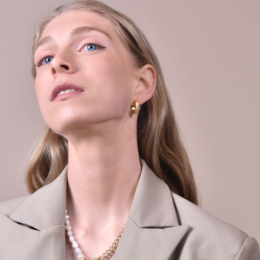 Contemporary, timeless and versatile for styling. Introducing Isador Textured Deco Hoop Earrings (Gold) - a raw style textured ear love to add a subtle uniqueness to your daily styling. Inspired by coastal cultures, this design features textured C hoops made of solid sterling silver with 2.5 microns of 18k quality gold plating (heavy gold plated) to ensure durability and hypoallergenic wear. The earrings are of a comfortable weight for all day wearing. Suitable for all personal styles and for unisex wear. Hypoallergenic, nickel, cadmium and lead free.