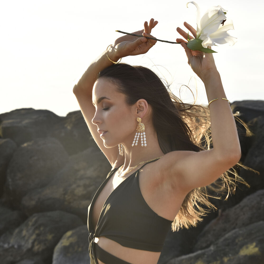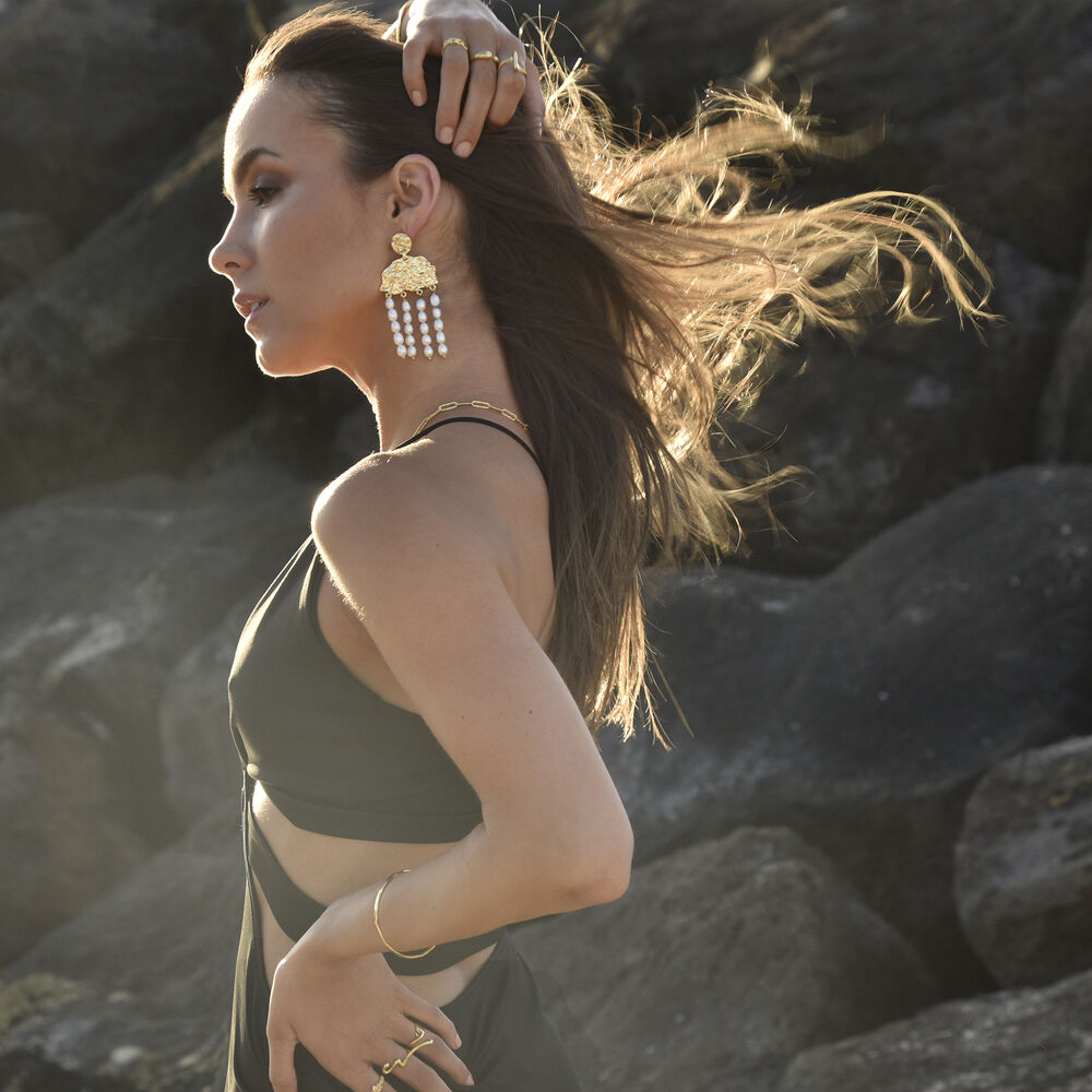 Artsy, eye-catching and extravagantly elegant. Introducing Jacinthe Luxury 24K Sculpture Pearl Drop Earrings - a contemporary sculpture inspired artisan pearl craft that turns heads. This design features two textual sculpture plates in round and semi circle embracing geometry, shape and textures. Connected with the middle sculptural plate are 4 strands of premium quality Western Australian natural freshwater pearls. Each pearl is handpicked to ensure consistent size, smooth surface and a stunning high lustre. The earrings are made in environmentally friendly brass with 2 microns of pure 24K gold plating (4 times thicker than average fashion jewellery). The earring posts are made in thickened sold sterling silver to ensure hypoallergenic wear. A creative, striking and unique ear art perfect for modern, artsy, chic, dressy, formal, bridal, wedding, semi-formal, creative styling, high fashion styling, runway, red carpet, smart casual style and more.