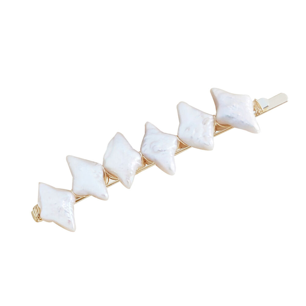 Unique freshwater pearl beauty for your elevated chic styling. Introducing Jamaica Artisan Freshwater Pearl Hair Clip - a hand-wired fine pearl craft for pearl lovers. This design features cultured diamond-shaped freshwater pearls with stunning lustre. Each pearl maintains its authentic natural textures and rawness. Perfect for coastal, summer, beach, bridal, wedding, dressy, earthy, bohemian, smart casual styles and more.