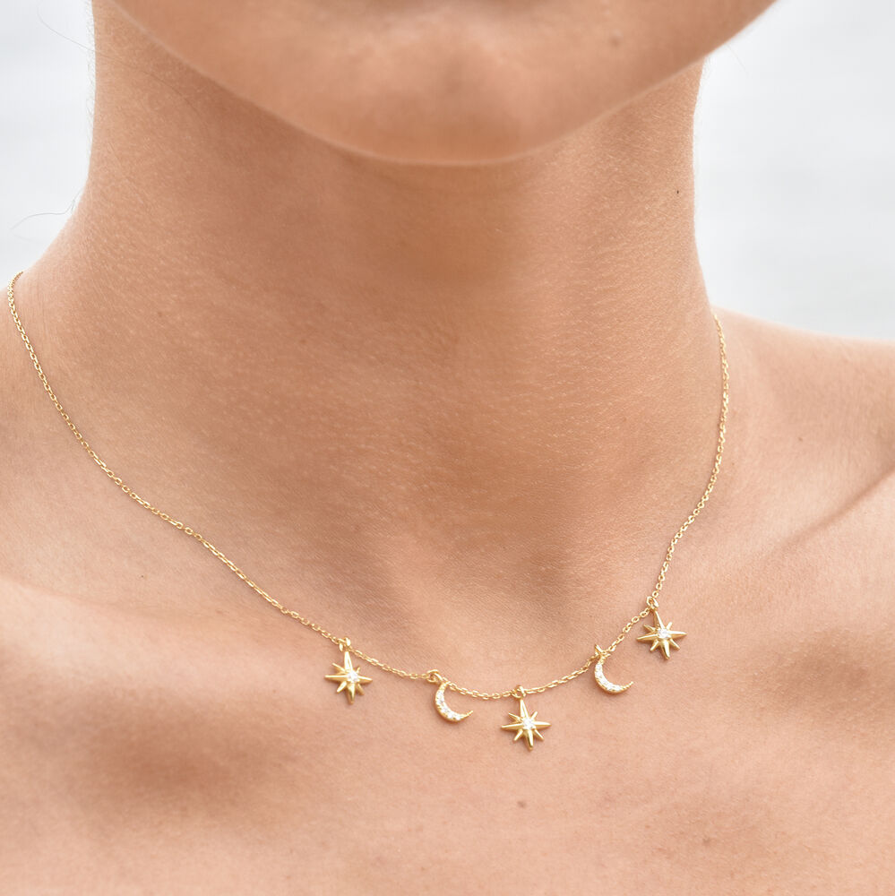 Feminine, chic, and delicate. Introducing Jayla Celestial Beauty Necklace (Gold) - a fine style neckpiece with celestial adornments. This design features 3 starburst and 2 moon crescent pendants adorned with Austrian zirconias - evenly spaced around the bottom of the necklace. The necklace and pendants are made of sterling silver with 18K gold plating. The necklace is 39.5cm long including a 10cm adjustable link, allowing it be worn as a choker as well. Perfect for modern, retro, chic, fine, necklace layering, boho, smart casual, casual, everyday styles and more. Suitable for teens. Hypoallergenic, nickel, cadmium and lead free.