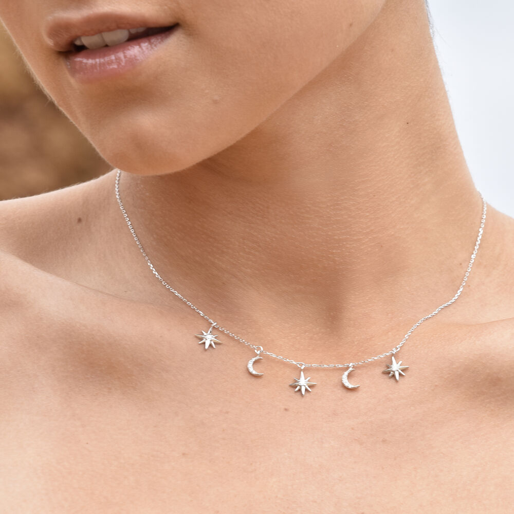 Feminine, chic, and delicate. Introducing Jayla Celestial Beauty Necklace (Silver) - a fine style neckpiece with celestial adornments. This design features 3 starburst and 2 moon crescent pendants adorned with Austrian zirconias - evenly spaced around the bottom of the necklace. The necklace and pendants are made of sterling silver. The necklace is 39.5cm long including a 10cm adjustable link, allowing it be worn as a choker as well. Perfect for modern, retro, chic, fine, necklace layering, boho, smart casual, casual, everyday styles and more. Suitable for teens. Hypoallergenic, nickel, cadmium and lead free.