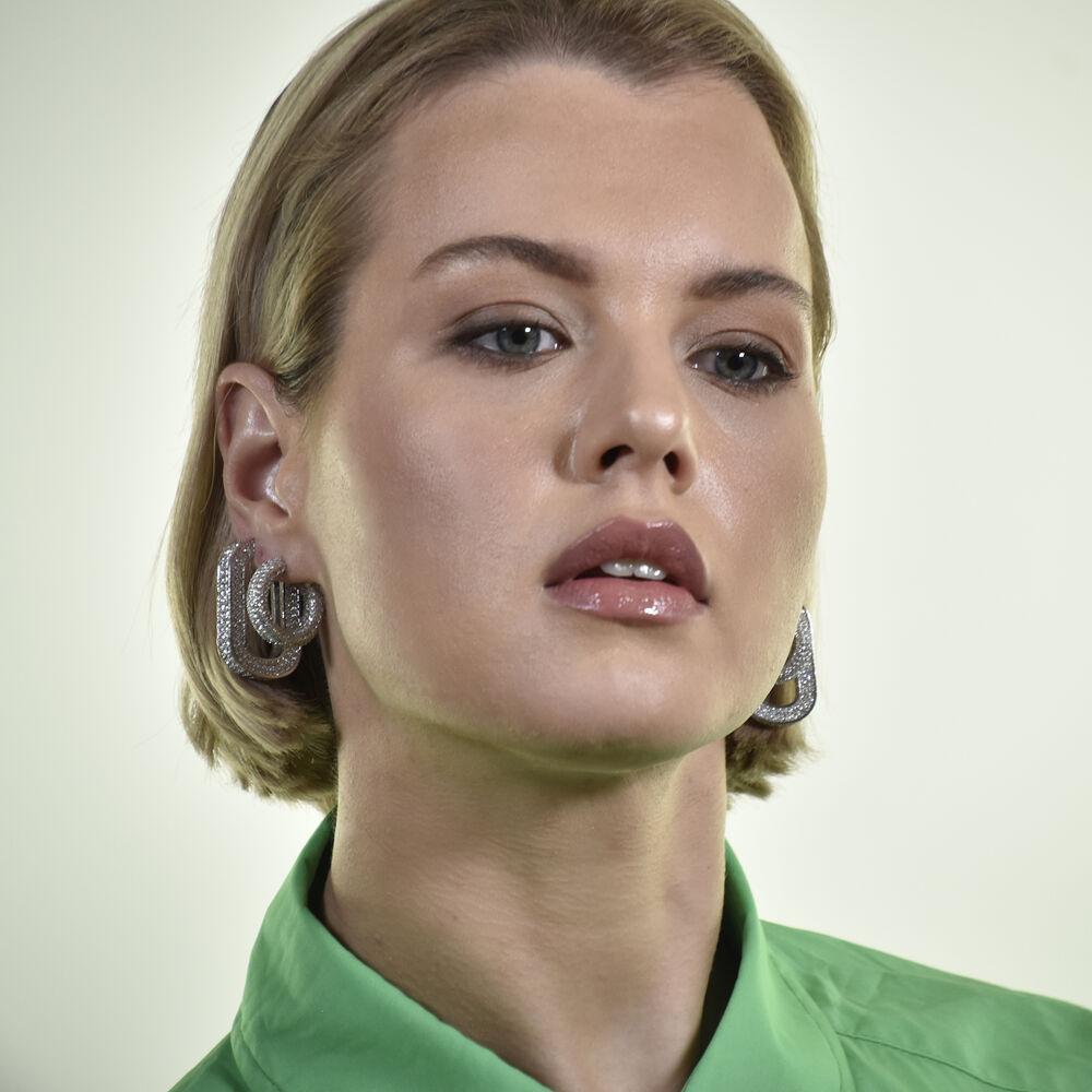 Elevated chic glamour with full sparkles. Introducing Lamia Diamnate-embellished U-hoop Earrings - an outspoken statement with shimmering luxe. This design features an on-trend U-hoop earring style adorned with inlaid Austrian cubic zirconias. The earrings are made in environmentally friendly brass with silver plating. An eye-catching and flamboyant earring style for dress-ups and personality showcase. Perfect for modern, retro, formal, semi-formal, chic, glamorous, feminine, earring layering, smart casual, casual styles and more. Hypoallergenic, nickel, lead, and cadmium free.