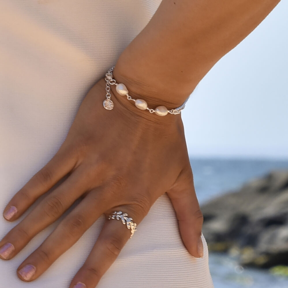 Pearl elegance leashed by fine dual chains. Introducing Louve Freshwater Pearl Dual Chain Bracelet (Silver) - a contemporary style fine wrist love exuding diamante shimmer and pearl lustre. This design features a dual chain - including 1 diamante chain inlaid with Austrian cubic zirconias, and 1 link chain made of a half cuban link and a half pig nose link. The dual chain is connected with 3 natural freshwater pearls, handpicked to ensure smooth surface and high natural lustre. This bracelet is made of solid sterling silver with precious white rhodium plating for enduring wear. It also comes with a 3.5cm adjustable link for a more flexible fitting. A round textural plate is also attached to the bracelet for a final artsy touch - because detail matters. A refined, chic, unique and ethical piece perfect for lovers of pearl and fine styles. Hypoallergenic, nickel, cadmium and lead free.