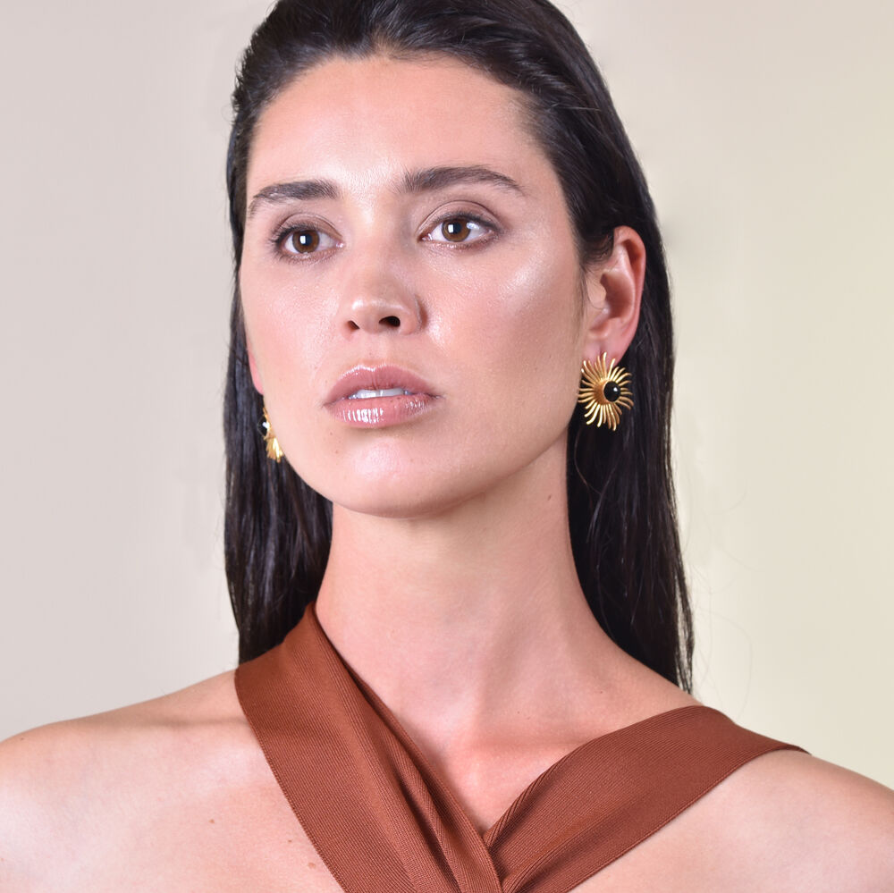Be your own sunshine. Introducing Lumina Artisan 24K Onyx Sun Earrings - an artisan crafted piece with a highlight of natural black onyx gemstones. This design is inspired by Rupi Kaurs literature The Sun and Her Flowers and ethically crafted with love. The earrings are made of environmentally friendly brass (nickel free) with 24k pure gold plating. In the centre of the sun is embedded a natural black onyx gemstone. A unique and glorious ear love that has an uplifting energy. Perfect for modern, artsy, creative styling, high fashion, dressy, chic, punk, smart casual styles and more. Hypoallergenic, nickel, cadmium and lead free.
