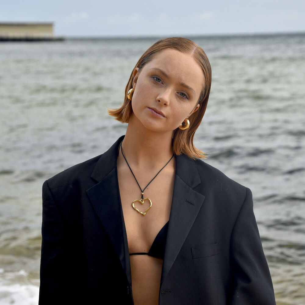A statement that doesnt compete. It just is. Introducing Mason Sculptured Heart Pendant Necklace (Gold) - a contemporary art inspired pendant piece for the modernists. This design features a sculptured outline big heart pendant attached to black tieback strings. Tie the strings at the length you desire. The heart pendant is made in environmental friendly stainless steel with 18ct gold plating. Wearing on its own or layering, it just cant be missed. Available in gold or silver.