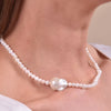Elegance that attracts a second glance. Introducing Milani Off Centre Pearl Necklace a unique pearl necklace that excels and challenges the norm. This design features natural freshwater pearls with a larger baroque pearl pendant positioned to one side, forming an asymmetric aesthetic beauty that steals a second glance. Perfect for those who seek something different yet tick the elegance and timelessness box. Hypoallergenic, nickel, cadmium and lead free.