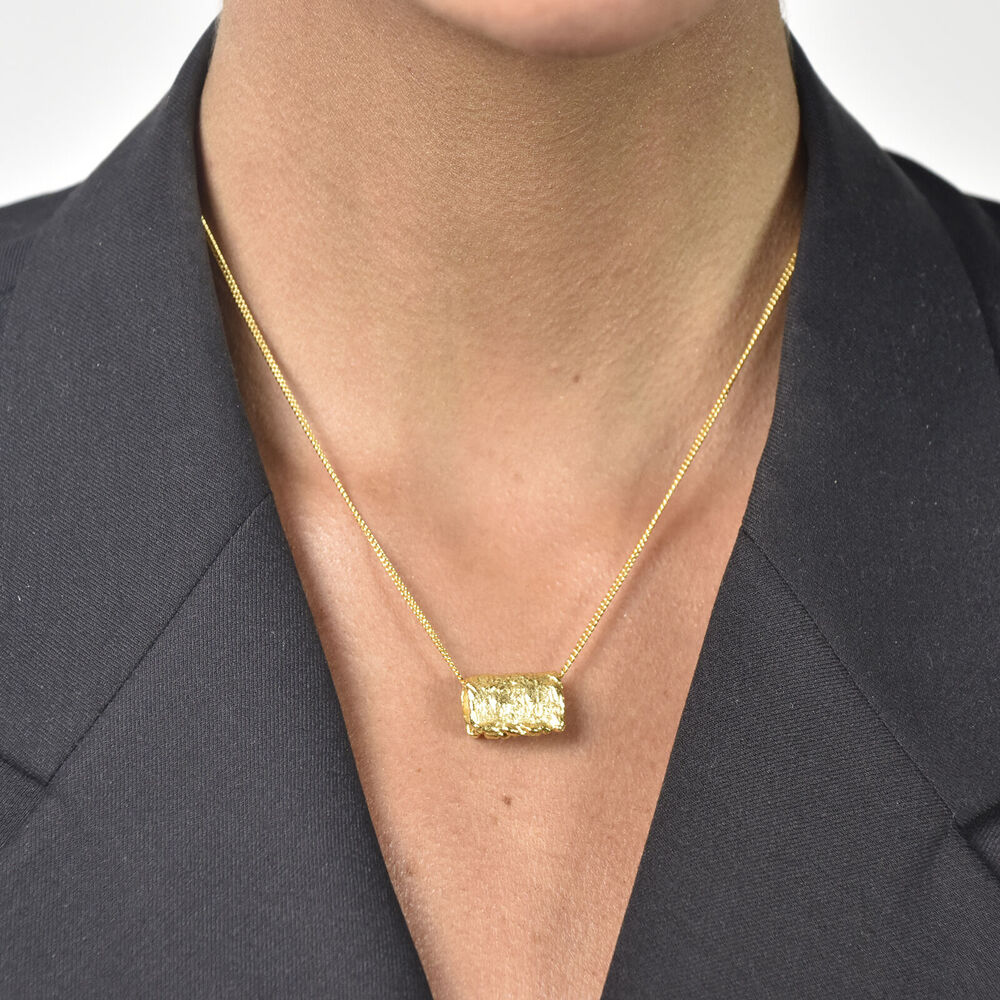 Textures infused with rawness and non-conformity. Introducing Louca Sculptural Fold Pendant Necklace (Gold Vermeil) - an artisan crafted neckpiece inspired by coastal rocky textures. This design features a loaf style solid fold with rich textures. This neckpiece is crafted in solid sterling silver with 2.5 microns of 18K gold plating (to Gold Vermeil Jewellery Standards) for hypoallergenic and enduring wear that speaks of artistic style. Perfect for contemporary, artsy, creative, coastal, chic, punk, necklace layering, smart casual, casual, everyday style and more. Hypoallergenic, nickel, lead, and cadmium free.