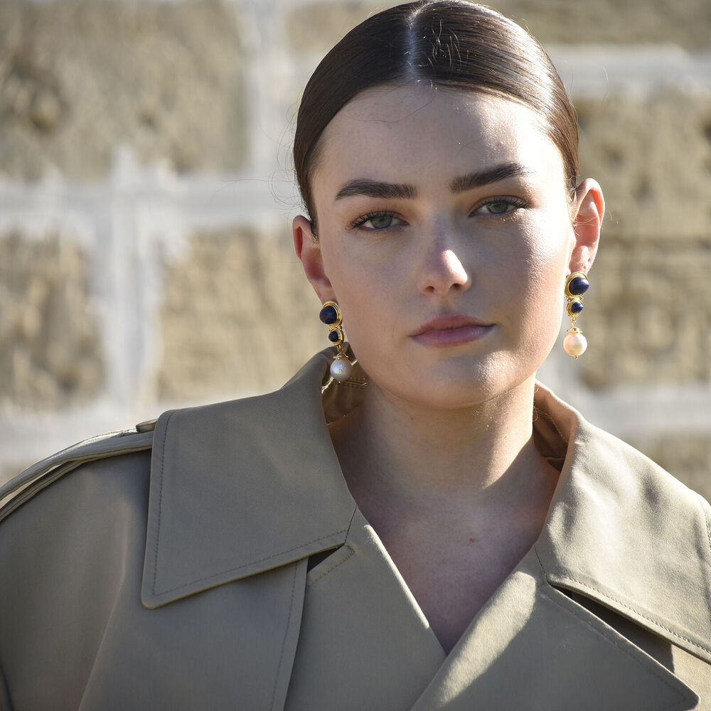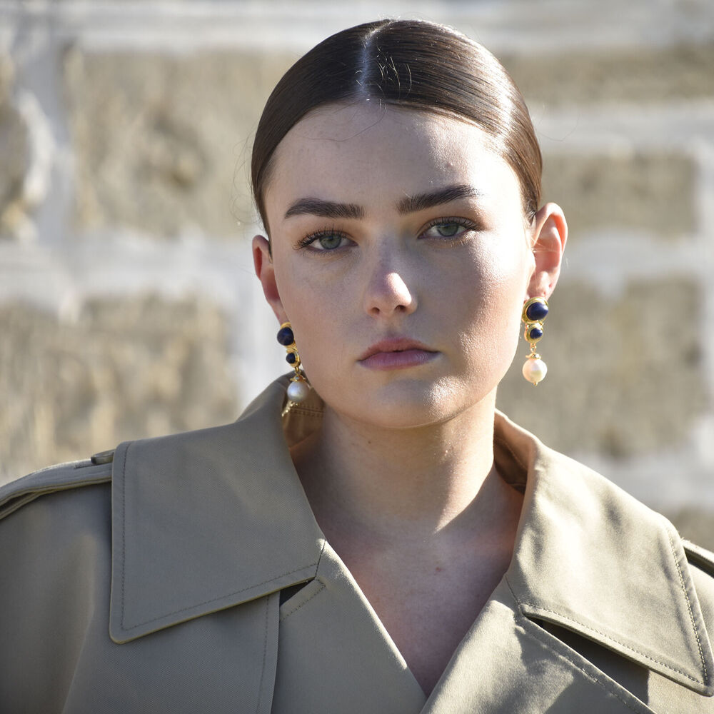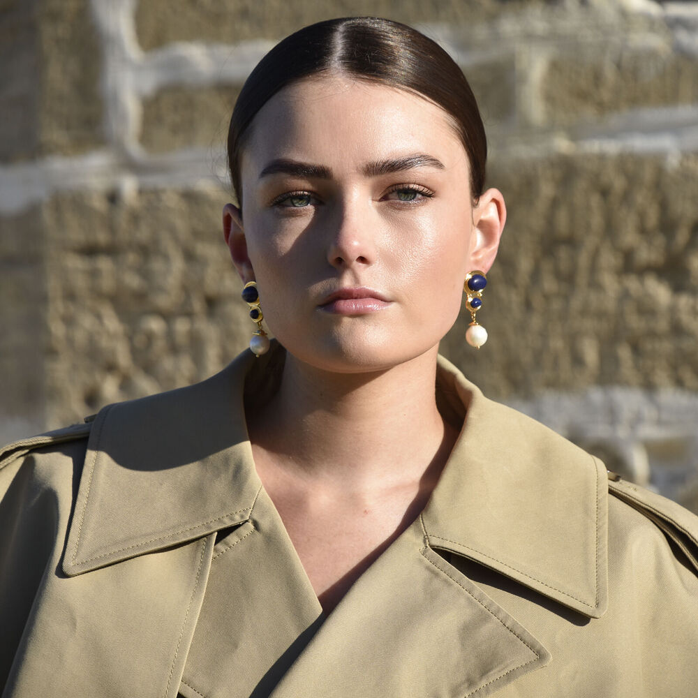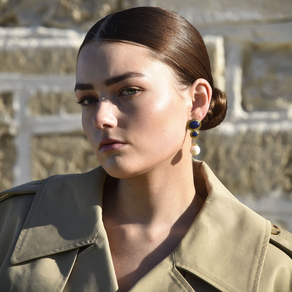 The sweet love between the moon and the deep blue sea. Introducing Odette Lapis Lazuli Pearl Drop Earrings - an artisan pearl drop inspired by the soothing energy of the sea and the moon. This design features highly polished natural lapis lazuli gemstones set in vintage style oval frames, with a dangle of natural baroque pearls. The earrings are made in environmentally friendly brass with 18k gold plating. A unique and one of a kind pearl drop for modern, retro, creative, coastal, dressy, smart casual, casual styles and more. Hypoallergenic, nickel, lead, and cadmium free.