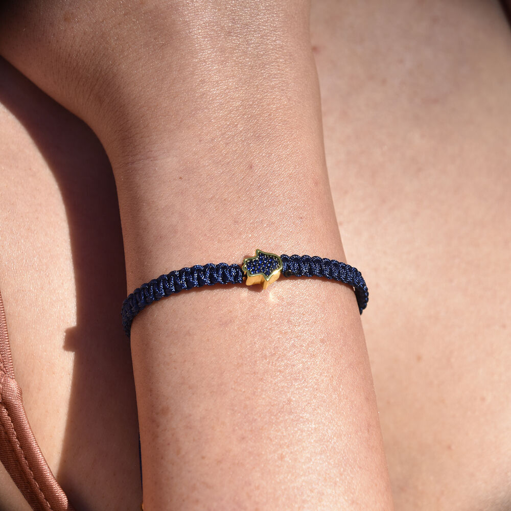 Let no sadness come to this heart, let no trouble come to these arms, let no conflict come to these eyes, let your soul filled with blessing and joy. Introducing Sacha Pave Hamsa Hand Bracelet (Gold Charm Blue String) - let the ancient symbol of protection and peace ward off evil energy and bring love, joy and lucky closer. This design features a 5mm thick braided string bracelet adorned with a micro pave hamsa hand with gold embedding. A versatile and gender-neutral piece made for everyday wear. This bracelet comes with an adjustable string knot for a more flexible personal fitting.