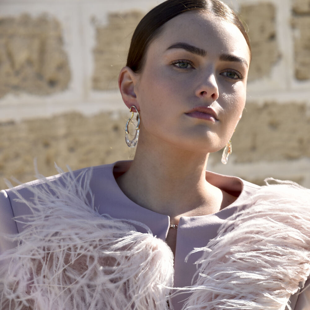 I see metal as fluid architecture. Introducing Vanora Two Tone Fluid Loop Earrings - a contemporary and artsy style ear love that embraces flow, sculptured form and asymmetric beauty. This design features an irregular shaped loop with 2/3 made of metal (environmentally friendly brass with 14K gold plating) and 1/3 made of clear resin. A creative statement that compliments modern, semi-formal, smart casual, artsy, casual styles and more. Hypoallergenic, nickel, cadmium and lead free.