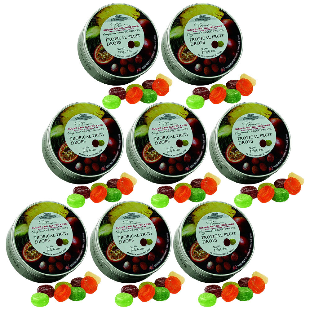 Simpkins Sugar Free Tropical Fruit Drops 8 x 175g Tins Gluten Free Travel Sweets